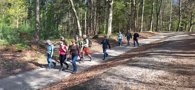 Op deze zonnige ochtend verzamelden de wandelaars zich in de tuin van Cees en Agnes Mudde in Maarn, waar ze verwelkomd werden met een kop koffie of thee. De groep die voor de 10 kilometer had gekozen, vertrok als eerste. Hun route voerde door het bos langs het bouwland, richting het bekende ‘Bankje’. Ook mochten zij even het terrein van de kazerne op om foto’s te maken bij het beeld van de marinier. Vervolgens werd de tocht voortgezet naar de Maarnse Zandafgraving.