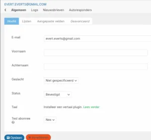 Klik in het linkermenu onder Newsletter “Abonnees” aan. Je komt dan in het volgende scherm