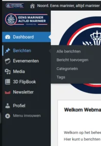 Daaronder staat ” Berichten” . Als je hier met je muis op gaat staan opent een sub-menu met keuzemogelijkheden. Alle Berichten, Nieuw Bericht maken, Categorie en Tags