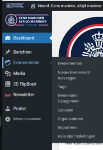Daaronder staat “Evenementen” OOk hier een sub-menu als je er met de muis op gaat staan. Daar krijg je diverse zaken die je kunt invullen en aanpassen.