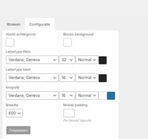 Op het configuratietabblad kun je de achtergrond kleur instellen, de lettertypes, de kleur van de lettertypes van de titels, inhoud en de eventuele knop. Naast de tekstkleuren kun je ook de grootte van de letters instellen.