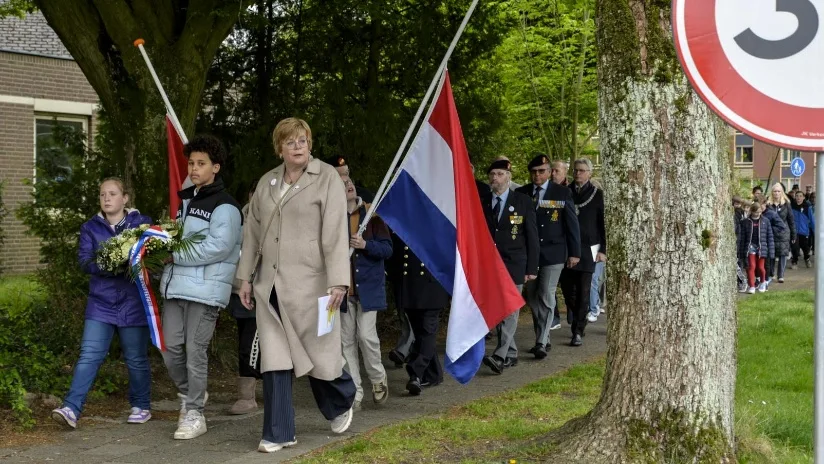 Na de lunch gingen we onder leiding van de leerkracht, mevr. Jacozien, de burgemeester, de directeur en groep 7 & 8 en hun ouders naar het monument. De kinderen liepen stil achter elkaar en zo vormde wij een grote groep.