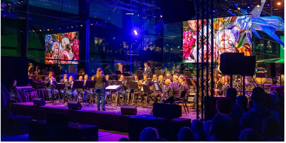 Live muziek pal onder een F-16 gevechtsvliegtuig dat in de expositieruimte lijkt te zweven. Of klanken beluisteren voor een imposant beeldscherm met daarop de film De Nieuwe Wildernis. Zo’n 3.000 bezoekers konden afgelopen weekend hun hart ophalen tijdens de Nacht van de Militaire Muziek in het Nationaal Militair Museum te Soesterberg.